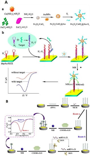 Magnetic nanoparticles such as Fe3O4 were also employed as a reporter for RNA detection. As an example, a biosensor was developed with the objective of simultaneous detection of miRNA-141 and miRNA-21. In this case, two RedOx molecules, Thi and Fc are attached to the magnetic nanoparticle and the captured probe leading to a large number of RedOx molecules attached. In the presence of miRNAs, the hybridization chain reaction was performed, and then the DNA1/Fe3O4NPs/Thi and DNA2/Fe3O4NPs/Fc were captured by the formed dsDNA, which generate a large number of magnetic nanoprobes attached to the surface. A magnified response of currents is obtained with good stability for 4 weeks and was applied for the diagnosis of miRNA in human breast cancer cells [72].