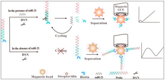 Zhang et al. [113] used DSN for miRNA-21 detection coupled with a capture probe labeled with biotin and SA-coated AuNPs, which were immobilized on the electrode surface due to the SA/biotin interaction. The numerous SA-coated AuNPs can subsequently immobilize a large number of biotin-labeled HRP molecules. Indeed, AuNPs were used as nanocarriers for HRP, helping to maintain their enzymatic activity. HRP was used to catalyze the reduction in H2O2 and in the presence of TMB, electrochemical current signals can be generated, which considerably enhances the electrochemical signal for miRNA-21 detection. The proposed biosensor permits an LOD of miRNA-21 down to 43.3 aM. The proposed biosensor allows an analysis of miRNA-21 in the human lung cancer cell line (A549 cells).