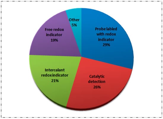 This strategy is based on the use of a RedOx molecule labeled to the probe through a linker such, nanomaterial, polymer, and streptavidin and leads to RedOx signal amplification leading to signal ON. This allows the immobilization of a large number of RedOx molecules after a hybridization reaction leading to the high sensitivity of the biosensor (Figure 5).