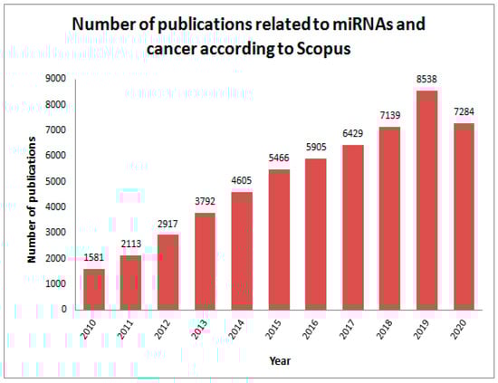 Number of publications in the field of micro-RNAs and cancer in the period between 2010 and 2020 (www.scopus.com, analyzed by years) (consulted 25 October 2020) (Keywords: micro-RNAs, cancer).