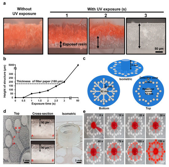 Control of cross-linked structures and flow inside filter paper. (a) Cross-sectional views of the resin inside the paper with and without ultraviolet (UV) exposure at different times (1–3 s). The black arrow indicates exposed resin areas. (b) Height of cross-linked resin structures inside the paper at different exposure times (0–60 s). The dotted black line indicates the thickness of the paper. (c) Bottom, top, and isometric views with dimensions of the design for the 3D-μPADs. (d) Cross-sectional images of two different channels and an isometric image of a sample reservoir. The black arrow indicates exposed resin that is the height of the structure. (e) Flow distribution in the 3D-μPADs at different times (0–150 s). For visualization of flow, red ink (300 μL) was added into the sample reservoir (center).