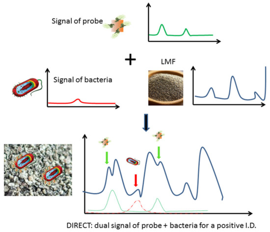 Scheme of the DIRECT assay, identification of peaks attributed to bacteria (red) and probes (green) yields a positive detection of contamination in LMF.