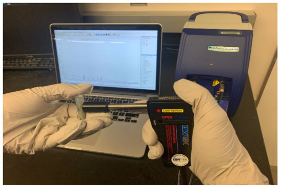 As shown in Figure 2, the sample in the tube was then subjected to Raman measurement using a portable Raman spectrometer (i-Raman Plus, B&W Tek, Inc., Newark, DE, USA). The tube was put against the head of the fiber optical probe of the spectrometer, to allow the laser beam (15 mW, 785 nm NIR laser, 3 cm−1 spectral resolution, 400–2000 cm–1 range) to penetrate the plastic tube wall. Raman spectra of the sample were obtained directly in one single step. A 60 s integration time was used for spectral acquisition. A total of 15 spectra were collected from each sample to calculate an average spectrum, which was used for further analysis. All experiments were conducted in triplicates.