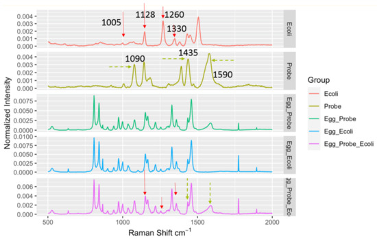 Spectral indicators showing presence of E. coli in spiked egg powder at 103 CFU/g. Key Raman peaks were indicated by vertical lines, with red indicating E. coli relevance and green indicating probe relevance.