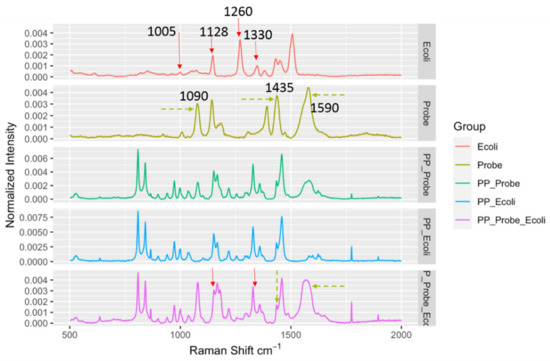 Spectral indicators showing presence of E. coli in spiked black pepper powder at 103 CFU/g. Key Raman peaks were indicated by vertical lines, with red indicating E. coli relevance and green indicating probe relevance.