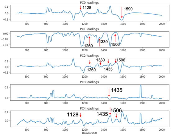 Since the complication brought by the LMF backgrounds made simple visual inspection of the spectra unreliable and inconclusive, to better differentiate the signals from the DIRECT assay between contaminated (spiked) samples vs. control (unspiked) samples, a support vector machine (SVM)-based discriminant analysis was conducted to evaluate whether significant differences among the spectral signatures between the two groups of samples could be identified. The SVM model was constructed with principal components calculated from the spectral set of 80 randomly selected spectra (40 from each group, e.g., spiked black pepper powder vs. un-spiked black pepper powder); another set of 12 spectra from each group (also randomly selected) were used for testing the SVM model. Principal component (PC) analysis is routinely used for the reduction in complexity of spectral data to facilitate discriminant model construction. In this study, it was shown that the first five PCs accounted for over 90% of the total variance among the data sets for both egg powder and black pepper powder assays. As shown in Figure 5, the loadings of the first 5 PCs for the black pepper powder assays showed that these three PCs (1128 cm−1 and 1590 cm−1 peaks in PC0, 1260, 1330 and 1506 cm−1 peaks in PC1, 1260, 1330, 1435 and 1506 cm−1 peaks in PC2, 1435 cm−1 peaks in PC3, and 1128, 1435 and 1590 cm−1 peaks in PC4) were associated with the DIRECT identification of E. coli in the samples. Similar results were also obtained for egg powder samples, as shown in Figure S2.