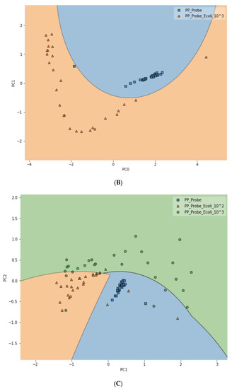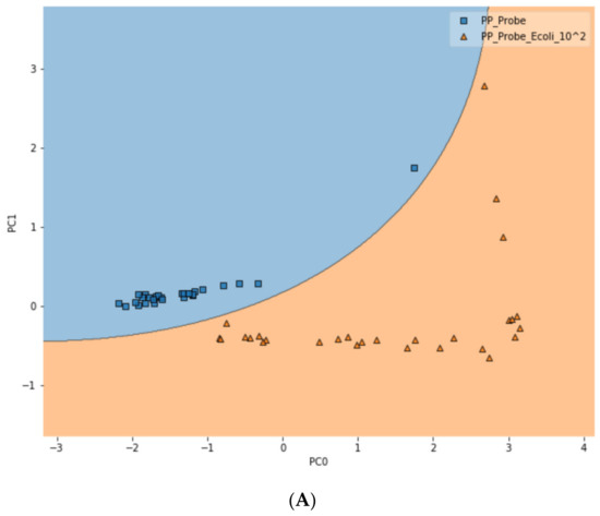 To further test the limit of detection (LOD) of the DIRECT assay on LMFs, both LMF samples were also spiked with E. coli at the 102 CFU/g level. For waterborne samples, it has been shown that the DIRECT assay can reach a LOD of 1–10 CFU/mL; but for the LMFs, that level of LOD would not be realistic. For 102 CFU/g, however, the DIRECT assay appeared to work well, with only a slight decline in the differentiation accuracy. For black pepper powder, with the PCA-SVM model, the differentiation accuracy became 94.4% (compared to 97.2% at 103 CFU/g); and for egg powder, it became 83.3% (compared to 87.5% at 103 CFU/g). Figure 6 showed typical differentiation results by the PCA-SVM discriminant analysis that revealed clear separation of un-spiked vs. spiked black pepper powder samples at 102 CFU/g contamination and 103 CFU/g contamination. The SVM separation suggested that a semi-quantitative assay could potentially be developed that would allow a quick estimate of the contamination level. Similar results for egg powder samples are shown in Figure S3.