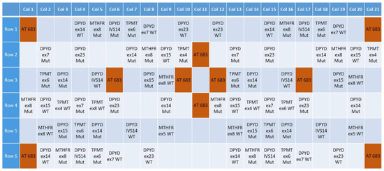 In this work, we selected 17 different allelic variants, eight of which are nonfunctional variants, for DPYD (g.226525A; g.226525G; g.410273T; g.410273G; g.410273A; g.475992T; g.475992C; g.476002G; g.476002A; g.843669A; g.843669T), MTHFR (g.16685A; g.16685C) and TPMT (g.16420G; g.16420C; g.21147G; g.21147A) genes (Table 1), based on their involvement in drug response according to PharmGKB (http://www.pharmgkb.org), Online Mendelian Inheritance in Man (OMIM—http://www.omim.org) and Single Nucleotide Polymorphism (dbSNP—http://www.ncbi.nlm.nih.gov/SNP) databases. For the analysis of these variants, primer sets were designed to amplify selected regions with a range of melting temperature of 59.4 ± 1.8 °C, guanine-cytosine (GC) content between 36–55%, and target size from 177 bp to 300 bp (Table 2). In addition, 31 allele-specific capture probes were designed to complementary align with wild type (WT) and mutated (M) sequences (Table 3) subdivided as follows: 22 capture probes complementary to DPYD hotspots (10 WT and 12 M); 4 capture probes complementary to MTHFR hotspots (2 WT and 2 M), 5 capture probes complementary to TPMT hotspots (2 WT and 3 M). After in silico testing, allelic capture probes were synthetized and spotted with a duplicated layout on the PGx-LoC microarray area. Additional capture probes complementary to AT683 hybridization control were spotted with a specular pattern for grid alignment (Figure 2).