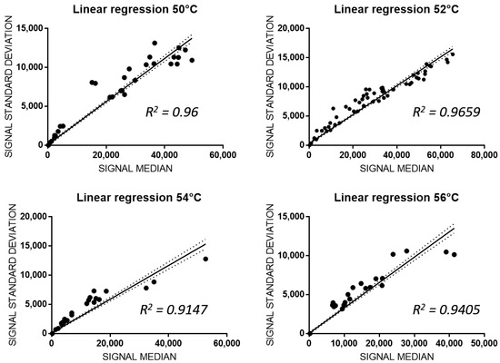 In an microarray-based detection assay, different hybridization conditions, such as temperature, denaturation mode, incubation time or the concentration of the analyte, are crucial [25,26]. As reported in our previous study [22], four different hybridization temperatures based upon the temperature melting (Tm) values of allele-specific capture probes, from 50 °C to 56 °C, were tested to evaluate inter- and intra-assay variability. After genomic amplification and hybridization of the selected 17 allelic variants of the wild-type genome shown in Figure 3, fluorescence intensities of allele-specific capture probes were detected and linear regression analysis between median fluorescence intensities and their standard deviations was made. As shown in Figure 4, hybridized wild-type probes were 62% at 50 °C with a R2 = 0.96, 100% at 52 °C with a R2 ≈ 0.97, 56% at 54 °C with a R2 = 0.9147, and 50% at 56 °C with a R2 = 0.9405. In particular, at 50 °C, 54 °C and 56 °C no fluorescence was detected for the DPYD g.226525A, DPYD g.410273T, DPYD g.843669A and TPMT g.21147G related capture probes and no signal was detected for the mutated capture probes. Both fluorescence intensity and linear regression analysis demonstrated that the signal values for wild-type targets were complete and more accurate when hybridization is performed at 52 °C. At this temperature, the hybridization of 100% wild type probes and no hybridization signal in the mutated probes was observed, indicating this as the optimal hybridization temperature (p < 0.0001; R2 = 0.9659; Figure 4).
