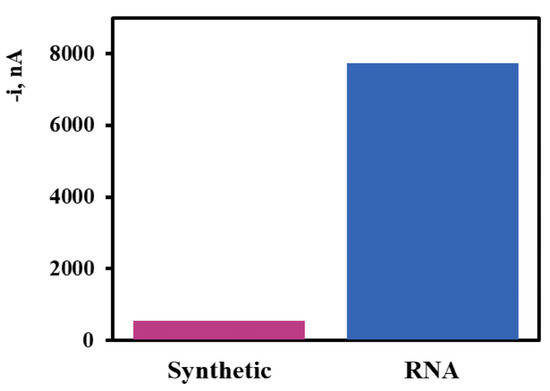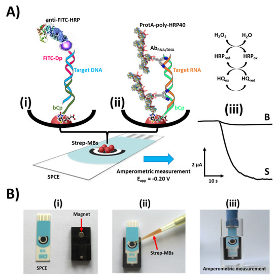 Target Recognition: The selective recognition of the FITC-labelled sandwich DNA/DNA heterohybrids captured onto the MBs and their enzymatic labelling were performed in a single step by incubating the modified MBs for 30 min (37 °C, 950 rpm) in 25 μL of a mixture solution, prepared in casein blocker solution, containing anti-FITC Fab fragments conjugated with HRP (anti-FITC-HRP, 2 μg mL−1) from Roche Diagnostics GmbH (Figure 1A(i)). Thereafter, the supernatant was removed, washed 2× in casein blocker solution and resuspended in 50 μL of 0.05 M sodium phosphate buffer solution (pH 6.0) before electrochemical detection. For the detection of total RNA with the single DNA probes, their enzymatic labelling was performed in a single step by incubating the single capture-signal probe-MBs for 30 min (37 °C, 950 rpm) in 25 μL of a mixture solution, prepared in casein blocker solution, containing 2 μg mL−1 of a commercial RNA-DNA hybrid antibody (AbRNA/DNA, clone: D5H6, from Covalab) and a commercial bacterial antibody binding protein (ProtA) conjugated with a homopolymer containing 40 HRP molecules (ProtA-poly-HRP40, dil. 1/50, from antibodies-online) (Figure 1A(ii)).