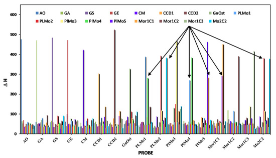 Plot of the enthalpy values needed to denature pairs of probes and targets.