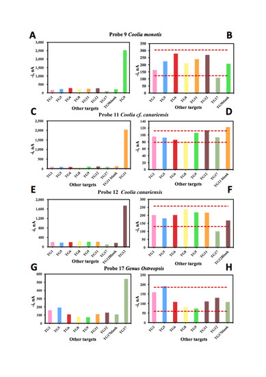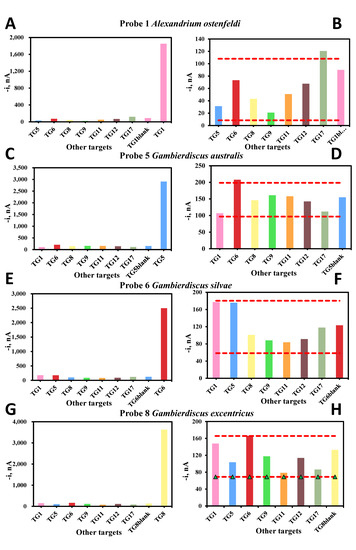 Figure 5 and Figure 6 show the electrochemical signal for 100 pM of synthetic DNA target bound to the capture and signal probes for eight probes targeting Gambierdiscus, Coolia, Ostreopsis, Lingulodinium and Alexandrium. The positive target is plotted with the negative targets in the left panel of each probe set. In the panel to the right, ± 1 × SD is plotted for only the non-targets to show that the signals for the non-targets are less than 1 × SD from the blank. In each case, the positive synthetic target is over 200× stronger than the non-targets.