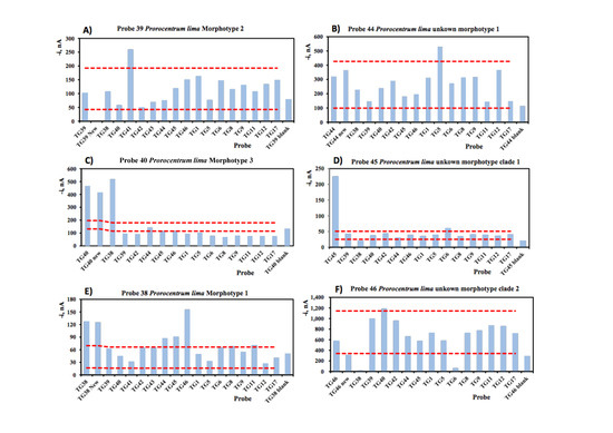 We have demonstrated the potential cross-reactivity of any of our probes graphically in Figure 3 and quantitatively in Table 2. The numbers in Table 2 indicate the absolute energy needed to disassociate the DNA/DNA helix of probe and target. All probes, except probes for clades of P. lima, showed in-silico a high specificity for the target probe. Several arrows in Figure 3 mark probes that are showing potential cross-reactivity among the P. lima probes. We either renamed or redesigned those probes. In P. lima, the empirical potential for cross-reaction was evident in most of the probes and at least one of the probes (probe set 39) was redesigned as probe set 76 before testing began.