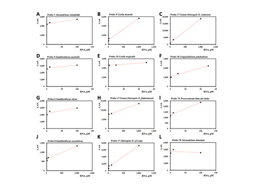 Concentration series were performed with those probes for which RNA was available (Figure 8). Because we found that many of the probes were saturated at 1000 pM (data not shown), we tested only the range 1, 10, 50 and 100 pM, occasionally 500 and 1000 pM. Good correlations between signal strength and RNA concentration (R2 > 0.90) were found for seven probes (probe 1: Alexandrium ostenfeldii, probe 8: Gambierdiscus excentricus, probe 9: Coolia monotis, probe 10: Coolia tropicalis, probe 17: Genus Ostreopsis (three strains), probe 36 Lingulodinium polyhedrum, probe 75: Prorocentrum lima all clades). Moderate correlations between signal strength and RNA concentration (R2 = 0.80–0.89) were found in two probes (probe 5: Gambierdiscus australis, probe 6: Gambierdiscus silvae). The only species so far tested that gave a poor correlation between the probe signal and RNA concentration was Alexandrium minutum. The signals obtained suggest that this probe (78) is saturated at 100 pM but this needs to be repeated with other RNA preps of this species. In several cases, we had multiple RNA preparations from different strains of the same species. Not all strains of the same species responded in a similar fashion but this could be an effect of the quality of the RNA extraction and whether or not the RNA was fragmented. The correlations likely varied with the quality of the RNA extraction and we present here the optimal correlation obtained.