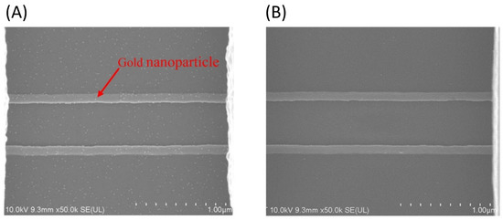 SEM was used to observe gold nanoparticle-conjugated anti-mouse IgG antibodies. The gold nanoparticle-conjugated anti-mouse IgG antibodies were designed to bind to the anti-sulfotyrosine antibody. The surface morphology of the functionalized pSNWFET, as observed on SEM, is shown in Figure 1. PSGL-1 peptides were first immobilized on the pSNWFET surface according to the aforementioned steps in the Materials and Methods section. By applying the PST–TPST coupled enzyme system, the PTS reaction of the tyrosine residue of PSGL-1 was performed, and sulfated PSGL-1 was then generated through TPST, as described in the Materials and Methods section. The anti-sulfotyrosine antibody is specific for the recognition of sulfated peptides and was used to confirm the presence of sulfated PSGL-1. The gold nanoparticle-conjugated anti-mouse IgG antibody, which in turn recognizes the anti-sulfotyrosine antibody, was subsequently used to cover the pSNWFET surface. As shown in Figure 1A, gold nanoparticles (10–12 nm) were observed in SEM images. However, as shown in Figure 1B, gold nanoparticles were not observed when the critical enzyme TPST was absent in the PST–TPST coupled enzyme system. The results verified that the surface modification and the in situ PTS on the pSNWFET surface were successful.