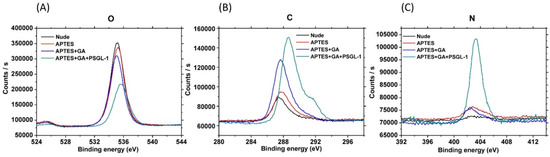 Further evidence for successful surface modification on poly-Si surface was obtained through XPS (Figure 2), which is an elemental analysis technique widely used to characterize the surface chemistry of materials used in bioengineering. Figure 2A–C represent the XPS spectra of oxygen, carbon, and nitrogen, respectively, during each immobilization step. The XPS peak of carbon and nitrogen is generally used as an indicator of organic molecule or protein deposition [30]. Previous studies have reported that the C 1s, O 1s, and N 1s spectra change under different modifications or conditions [31,32]. As oxygen is also on the poly-Si surface, significant variation of oxygen XPS spectra could be observed only after the PSGL-1 peptide was immobilized (Figure 2A). The characteristics of the C 1s spectra before and after the functionalization clearly indicated polypeptide immobilization on the poly-Si surface (Figure 2B). The C 1s peak of nude was a background value. Further, the N 1s spectrum showed an apparent peak at a binding energy of 402 eV, which corresponded to the numerous nitrogen atoms within the polypeptide. Table S1 shows the content of the surface elements of the modified surface, corresponding to the previous results. The results indicate that the PSGL-1 peptide was successfully immobilized on the pSNWFET surface through APTES and glutaraldehyde as linker molecules for biosensing application.