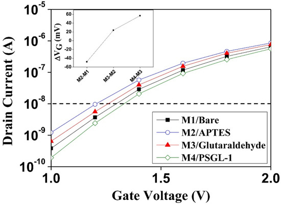 Surface alterations on the pSNWFET can be monitored through its electrical responses, which can be used to further confirm the surface functionalization at each modification step. Figure 4 illustrates the electrical response at each modification step. Following functionalization of amines on the n-type pSNWFET device through APTES (M2/APTES in Figure 4), a left shift from the baseline (M1/Bare in Figure 4) was observed. The increase in ID was induced by the positive charges on the NW surface after APTES modification. Subsequently, the surface was functionalized by an aldehyde group following glutaraldehyde treatment. ID decreased (M3/glutaraldehyde in Figure 4) because of the formation of imine and elimination of positive charges. Finally, the device was modified with the PSGL-1 peptide on the surface, and electrical measurement was performed, resulting in a considerable decrease in ID (M4/PSGL-1 in Figure 4). The shift could be attributed to the presence of negative charges within the PSGL-1 polypeptide, which contains four acidic amino acids. As shown in Figure 4, at each modification step, the ID-VG curves shifted according to the SiNW surface charge. This result indicates that a sensitive pSNWFET device for assessing the surface properties of proteins with different modifications can be developed for biosensing application.