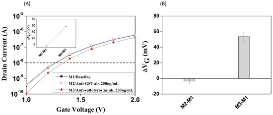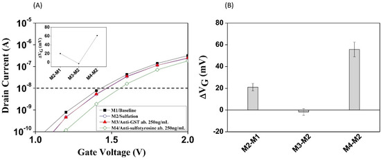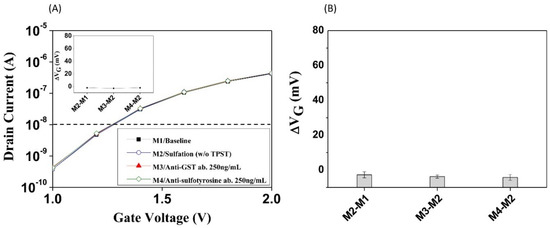 The pSNWFET was developed for biosensing applications including nucleic acids, cancer biomarker proteins, and other small molecules; it has been proven that the pSNWFET has the potential to serve as a platform for the detection of biomolecules [24]. In this report, we would like to demonstrate further, using PTS in situ protein modification as an example, that biochemical reactions can be directly monitored and confirmed on the pSNWFET. In the previous section, we demonstrated that on-chip PTS could be catalyzed by the PST–TPST coupled enzyme system, which was verified by SEM and ELISA as parallel experiments. Moreover, we demonstrated that enzyme-catalyzed protein sulfation on the NW surface was feasible and could be detected through real-time electrical measurement. The electrical response and specificity of the functionalized pSNWFET for PSGL-1 sulfation sensing are shown in Figure 5. As shown in Figure 5A, the sulfated PSGL-1 peptide (sulfated at the third tyrosine residue, ATEYEYLDYsDFL) was immobilized on the NW surface, and the electronic responses after the addition of antibodies were recorded. The ID-VG curve remained unchanged in the presence of noninteracting biomolecules (anti-glutathione-S-transferase antibody, M2, which serves as negative-controlled antibody to confirm that nonspecific binding does not occur with antibody other than the anti-sulfotyrosine antibody, in Figure 5A), indicating that the electrical condition of the pSNWFET was stable in the presence of nonspecific molecules. This is an important characteristic, as many nonspecific molecules that may carry charges exist in biological samples. The anti-sulfotyrosine antibody treatment resulted in reduced ID (M3 in Figure 5A), owing to the interaction between sulfated PSGL-1 and the corresponding high-affinity antibody, as proven in the previous section (Figure 3). This result showed that the sulfated peptide could be specifically detected on the pSNWFET surface by the anti-sulfo antibody and was consistent with that of the ELISA experiment (Figure 3). To normalize current alteration in electrical detection, a shift of gate voltage (ΔVG, shown in the inset figure) at ID = 10−8 A was calculated and is illustrated in Figure 5. The average values of ΔVG between base line/nonspecific antibody (M2-M1 in Figure 5A) and base line/anti-sulfo antibody (M3-M1 in Figure 5A) were −5 mV and 57 mV, respectively, as shown in Figure 5B. Figure 5A shows one of the four typical experiments, and the data of the other three experiments are shown in Figure S3A–C.