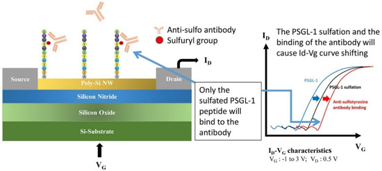 The following are available online at https://www.mdpi.com/2079-6374/10/12/213/s1, Figure S1: Electrical characteristics of the poly-Si NWFET, Figure S2: Eight consecutive measurements of ID-VG of the device, Figure S3: Electrical responses of the functionalized pSNWFET to PSGL-1 sulfation, Figure S4: Real-time response of the pSNWFET following different surface modifications, Figure S5: pH profile of the PSGL-1 modified surface, Table S1: Element contents on the modified surface.