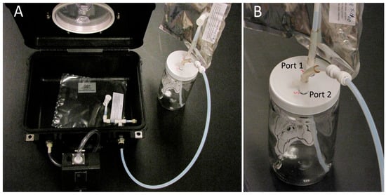 Bat VOC air collection apparatus assembly. (A) Pelican case vacuum chamber (containing PE-AL VOC air-sampling bag) with bat air-sampling chamber and Escort vacuum pump attached to vacuum chamber ports (left photo), (B) Close-up of bat air-sampling chamber with Port 1 (connected to pure zero-air replacement bag), and Port 2 (connected to outflow sample air tube attached to input port on Pelican case vacuum chamber (right photo).