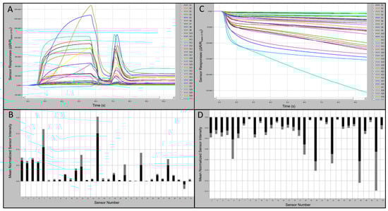Portable C-320 e-nose output runs and associated smellprint signatures. (A) Analysis run output from 60 s sample runs in the training test mode for 1-butanol VOC (alcohol chemical class); (B) Smellprint signature of 1-butanol from the 32-sensor array, normalized mean highest sensor responses in black (±SEM, gray error bar) during runs of 10 replicate samples; (C) Sensor output responses to a zero-grade ultra-pure moist air (UPMA) sample during a 90 s manual-test mode run; (D) Smellprint signature of UPMA from the 32-sensor array ran in the analytical training test mode, normalized mean highest sensor responses in black (±SEM, gray error bar) during runs of 10 replicate samples.