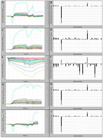 The method run parameters used for all analytical runs, specified for training sets consisting of six sample types each, utilized only one training repeat count and one identifying repeat count setting. The substrate heater was turned on and set at 35 °C and digital filtering was always turned on for training, identifying, and calibration modes. Data recording settings selected for all analytical methods were as follows: canonical algorithm, auto-scaling preprocessing of data, data normalization #1 method, medium identification quality (for sample discriminations), and 99.9% acceptance threshold. Symbols for sensor polarities and normalized highest mean sensor response intensity (msri) ranges of individual sensors within smellprint signatures for the C-320 sensor array are described in Table 2. Sensor response intensities indicate the mean change in electrical resistance recorded by each sensor (in response to all adsorbed VOCs), relative to the base-resistance condition when no VOC are adsorbed to the CP-coating on the CBPC sensor surface. The msri values of all sensors are assembled together and represented by y-axis values for all 32 individual sensors in the C320 sensor array as quantified (using bar length) in the data output bar graph (which collectively represent the smellprint pattern).