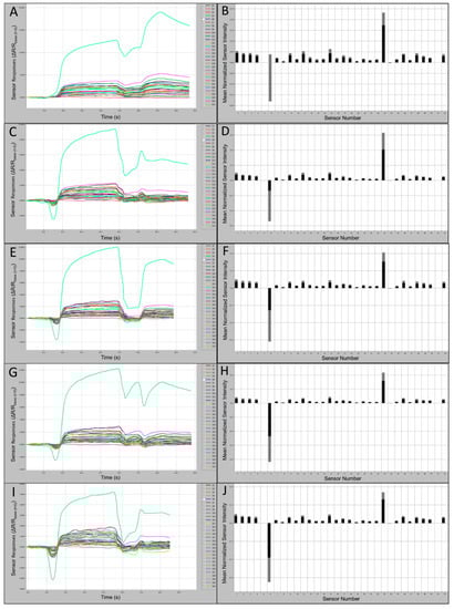 Bat air sample 60 s e-nose analysis runs with 32-sensor outputs and associated smellprint signatures. (A) Sensor-array outputs for Corynorhinus rafinesquii (CORA); (B) Smellprint signature of Corynorhinus rafinesquii; (C) Sensor outputs for Lasiurus borealis (LABO); (D) Smellprint signature of Lasiurus borealis; (E) Sensor outputs for Lasiurus seminolus (LASE); (F) Smellprint signature of Lasiurus seminolus; (G) Sensor outputs for Nycticeius humeralis (NYHU); (H) Smellprint signature of Nycticeius humeralis; (I) Sensor outputs for Tadarida brasiliensis (TABR); (J) Smellprint signature of Tadarida brasiliensis. Sensor S6 is not displayed. Smellprint bar graphs indicate mean sensor responses in black (±SEM, gray error bar).