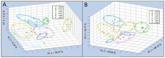 Comparison of C-320 e-nose VOC profiles of bat air samples from six species (Test Group 1) using 3-dimensional Principal Component Analysis (PCA) and Canonical Discriminant Analysis Cross Validation (CDA-CV). (A) Single-class PCA of VOC emissions from Corynorhinus rafinesquii (CORA), Nycticeius humeralis (NYHU), Lasiurus seminolus (LASE), Eptesicus fuscus (EPFU), Tadarida brasiliensis (TABR), and Lasiurus borealis (LABO); (B) CDA-CV of VOC emissions from the same six bat species in Test Group 1.