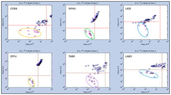 Analysis of aroma class ownership of C-320 e-nose VOC profiles based on bat air samples from six species (Test Group 1) using SIMCA Cross Validation (SIMCA-CV) secondary statistical tests. Analysis of Q-distance (Q-value) vs. score distance (T2-value) for each individual VOC aroma class (compared to all other classes) defined by VOC emissions from Class 1 = Corynorhinus rafinesquii (CORA), Class 2 = Nycticeius humeralis (NYHU), Class 3 = Lasiurus seminolus (LASE), Class 4 = Eptesicus fuscus (EPFU), Class 5 = Tadarida brasiliensis (TABR), and Class 6 = Lasiurus borealis (LABO).