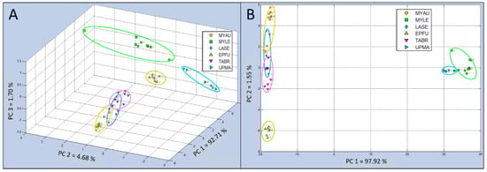 The 3-dimensional single-class PCA of Test Group 2 (including MYAU, MYLE, LASE, EPFU, TABR, and UPMA control sample types), indicated that three of the aroma classes (MYLE, EPFU, and UPMA) were well separated into distinct data clusters, whereas the other three aroma classes (MYAU, LASE, and TABR) had closely-distributed data clusters, indicating more similar chemical relatedness in VOC composition within bat air emissions (Figure 7A). Identified PCs of chemical constituents in VOC bat air samples indicated that the percentage of total variance, accounting for the variability in this test, explained by principal components were as follows: PC 1 = 92.71%, PC 2 = 4.68%, and PC 3 = 1.70%.