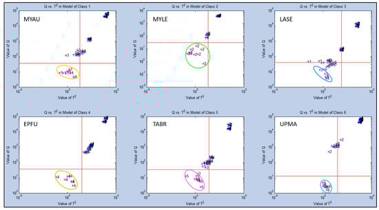 Analysis of aroma class ownership of C-320 e-nose VOC profiles based on bat air samples from five species and ultrapure-air control (Test Group 2) using SIMCA Cross Validation (SIMCA-CV) secondary statistical tests. Analysis of Q-distance (Q-value) vs. score distance (T2-value) for each individual VOC aroma class (compared to all other classes) defined by VOC emissions from Class 1 = Myotis austroripiarus (MYAU), Class 2 = Myotis leibii (MYLE), Class 3 = Lasiurus seminolus (LASE), Class 4 = Eptesicus fuscus (EPFU), Class 5 = Tadarida brasiliensis (TABR), and Class 6 = Ultrapure Moist Air (UPMA) control.