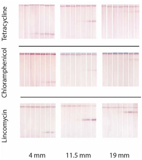Location of the test line on the membrane influence analytical parameters even for monoplex immunochromatography [17]. To characterize the corresponding features for all immunoreactants used in our triplex test, we placed the test zone for each analyte in three positions: 4, 11.5 and 19 mm. The obtained results for three antibiotics, tetracycline, chloramphenicol, and lincomycin, are given in Figure 1, and comparisons of calibration curves are integrated in Figure 2.