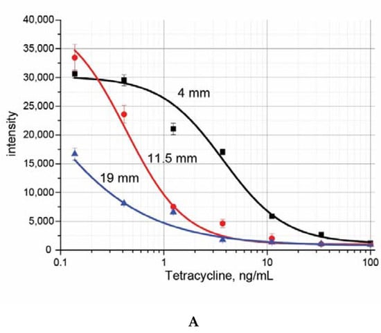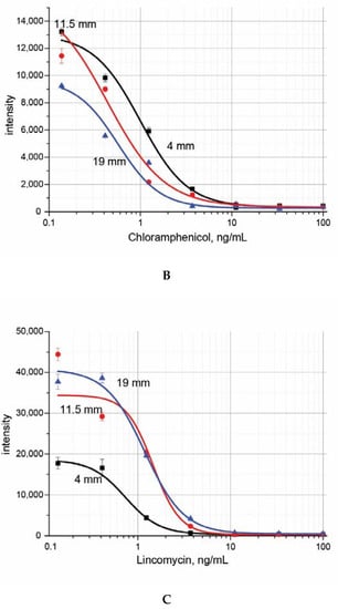 Our development for the assay of three antibiotics is important for food safety and medicine, where multiplexed tests are especially relevant. Due to the widespread use of antibiotic therapy, bacterial resistance has become a reason for more careful monitoring of their levels in the course of therapy. Tetracycline, chloramphenicol and lincomycin are widely used antibiotics in the treatment of diseases caused by microorganisms. However, their improper use has provoked massive resistance to them in many microorganisms. Resistance to tetracycline is described for strains of Pseudomonas aeruginosa, Proteus, Staphylococcus aureus (MRSA) and Streptococcus pneumoniae [19], to chloramphenicol for Bartonella and Staphylococcus [20], and to lincomycin for Kocuria kristinae, Sphingomonas paucimobilis, Pantoea, Staphylococcus vitulinus, Clostridium, etc. [21,22]. Individual correction of antibiotics dosage decreases the level of antibiotic-resistant bacteria in the intestines [23]. These reasons determine the practical importance of multitests for antibiotics not only for food safety control (where successfully commercialized tests are available) but also for planning efficient individual therapy.