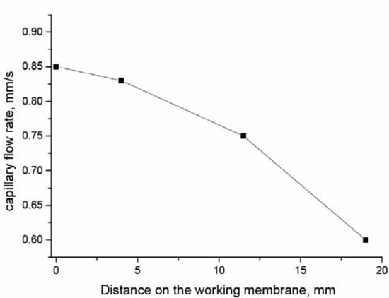 Considering mechanisms causing the demonstrated changes, we should two key factors that affect the flow rate of reagents: (i) size and surface properties of the pores of the working membrane and (ii) the location of the test zone. To estimate these changes, we recorded the flow rate in the course of reactants movement using an iPhone camera. We compared the coloration profile in 1 sec intervals, indicating the first image with reliable increase of the coloration at the test zone and calculatinf the flow rate as a ratio of the distance covered by the colored reagent to this time. The obtained data are summarized in Figure 3. The reagent flow reached the first test zone (4 mm) at an average rate of 0.83 mm/s. For the second test zone (11.5 mm) the average rate was 0.79 mm/s, and for the third zone (19 mm) it was equal to 0.60 mm/s. For different samples, the flow rate time is approximately the same. The edge of the working membrane in working buffer, milk and diluted serum (1:1) flow reaches in 27, 28 and 29.5 s, respectively.