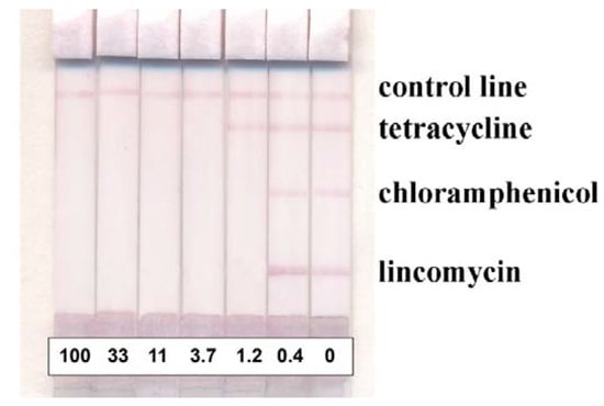 The LIN-BSA, TET-BSA and CAP-BSA conjugates (for the test zone) and mouse IgG (for the control zone) were applied to the working nitrocellulose membrane in an amount of 0.1 μL per 1 mm. The concentrations of LIN-BSA, TET-BSA and CAP-BSA conjugates were chosen on the base of our previous studies to provide sufficient coloration in the absence of analyte [24,25,26] and were equal to 1, 0.5 and 0.5 mg/mL respectively. The difference in the chosen concentrations for these commercial conjugates may be caused by their composition and/or sorption properties. The mouse IgG concentration was 0.05 mg/mL.