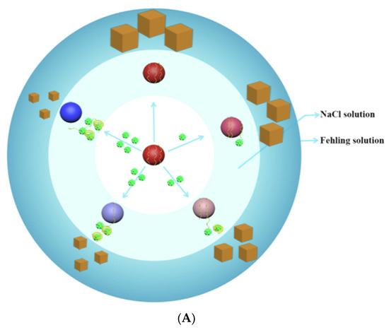 (A) Schematic illustration of the designed aptasensor for streptomycin (STR) detection utilizing enhanced catalytic activity of AuNPs. (B) TEM images and color of AuNPs solutions with and without streptomycin. Left: 50 nM STR1 aptamer + AuNPs; right: 50 nM STR1 aptamer + 1 mM STR + AuNPs [125]. Reprinted from [125]; with permission from The Royal Society of Chemistry.