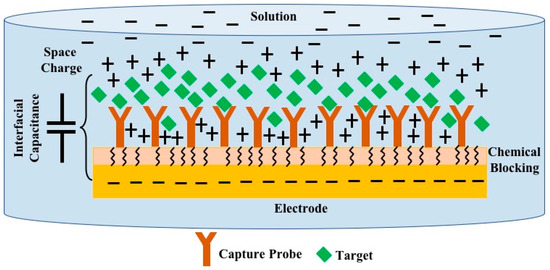Typical bio-functional electrode and solution interface, compact layer of charge in the solution (space charge) counterbalancing the charge on the electrode along with the immobilized bio-functional (capture probe) and chemical charge transfer blocking layers at the electrode surface form an interfacial capacitance. Binding of the target to the capture probe that alters the interfacial capacitance is utilized as the detection principle.