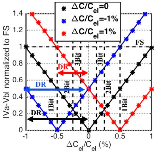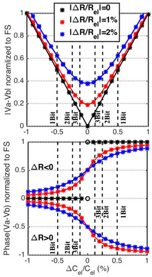 Figure 3 shows how varies with fractional changes in the transducer capacitance for different amounts of mismatch, . The results of Equation (4) (the markers) as well as more complete circuit-level simulation results (the solid line) are plotted in Figure 3, the phase of the transfer function is not shown here because, as seen in Equation (5), it is not affected by initial capacitive mismatches. The values used to obtain the results shown in Figure 3 are: , and . Moreover, the full scale change in the fractional transducer capacitance, , is 1%. It is seen that in the presence of capacitive mismatch, the magnitude of the differential output voltage still changes linearly with transducer capacitance, but with a horizontal shift. The result is a potential reduction in the dynamic range, when the capacitive mismatch opposes the change in the electrode capacitance, seen in the red curve in Figure 3. The vertical resolution lines in Figure 3 indicate that careful balancing of the capacitance values is critically. For example, consider a full-scale fractional change of 1% in the transducer capacitance, if the initial mismatch is also 1%, the resolution will be reduced by 1 bit due to saturation.