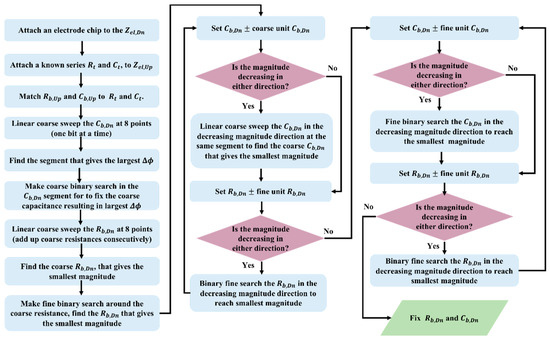AC balancing flow chart. A known impedance replaces one of the unknown transducers and the AC balance point is obtained by searching the coarse and fine capacitance and resistance array. Sweeping the arrays for the max phase change () quickly puts the bridge output around the minimum magnitude and by recurring fine search on the arrays, the best minimum magnitude is obtained.