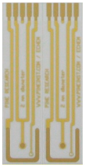 For non-faradaic measurement using the bridge structure shown in Figure 2b, two electrodes are required on each bridge leg: one working/functionalized and one counter. Each utilized transducer consists of a 2 mm diameter gold circle working electrode and a large U-shaped counter electrode, as seen in Figure 6, and is purchased from Pine Research Instrumentation, Inc (Durham, NC, USA). The uncoated, on-chip gold reference electrode seen in Figure 6 is left floating and is not used in our measurements.