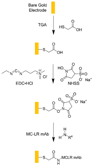 Representation of the surface chemistry modification of a gold patterned electrode. TGA can be replaced with other caroboxylic acid alkanethiol self-assembled monolayer (SAMs), such as 11-MUA. The schematic is not drawn to scale. TGA: thioglycolic acid; EDC⦁HCl: 1-ethyl-3-3-dimethylaminopropyl carbodiimide; NHSS: N-hydroxysuccinimide; MCLR mAB: Microcystin-(Leucine-Arginine) antibody.