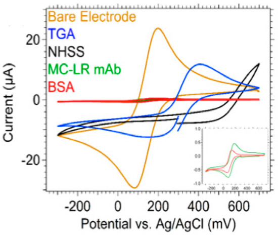 Cyclic voltammetry was used to characterize the surface chemistry functionalization by measuring the current that developed in the electrochemical cell from the WaveNowxv Potentiostat/Galvanostat System (Pine Research Instrumentation Inc). Cyclic voltammetry was carried out in 5 mM potassium ferricyanide (ACS reagent, assay ≥99%, CAS# 13746-66-2, Fisher Scientific, Hampton, NH, USA), an electroactive species, in 0.1 M KCl electrolyte solution with an applied potential sweep between –300 to +700 mV and a scan rate of 100 mV/s with five cycles performed at each functionalization step. Figure 8 shows the cyclic voltammograms illustrating the current (µA) as a function of the potential (mV) vs. a silver/silver chloride reference electrode. The bare gold patterned electrode (gold trace, Figure 8) showed reversible oxidation and reduction of the redox couple potassium ferricyanide/ferrocyanide. Upon adsorption of TGA (blue trace, Figure 8), there was a decrease of the current peak (cathodic peak current), which suggested that TGA monolayer hindered the transmission of electrons to the electrode surface. From the results, it was clearly seen that the peak current decreases at each successful surface modification step (Figure 7) for the cross-coupling of EDC/NHSS (black trace), and upon immobilization of MCLR mAb (green trace) and BSA (red trace) as shown in Figure 8.