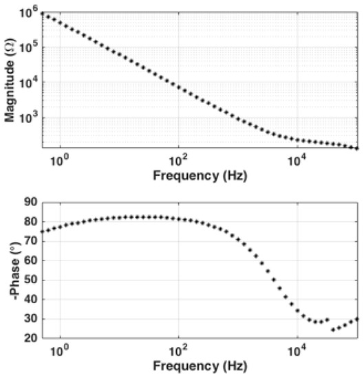 Moreover, EIS characterization is used to determine the optimum stimulus frequency for real-time single-frequency measurement. The measurement frequency should be chosen such that the interface capacitance is the dominant factor in the overall transducer impedance. EIS is performed with a 3 electrode setup, utilizing the working and counter electrodes on the transducer chip and a separate external Ag/AgCl reference electrode. The ZIVE SP1 Compact type Electrochemical Workstation (ZIVELAB, Seoul, Korea) is used for interface impedance characterization. The transducer chip and the external Ag/AgCl reference electrode were immersed in of PBS (pH 7.4), as explained above, inside a sealed beaker. The DC bias voltage on the external Ag/AgCl reference electrode and the working electrode on the transducer is set to with respect to ground. A amplitude sine-wave is applied between the working and the external Ag/AgCl reference electrode and the frequency of the sine-wave is swept from to . The interface impedance magnitude and phase data is collected thereafter by the ZMAN (ZIVELAB, Seoul, Korea) impedance analysis software and the data was exported to MATLAB for plotting. The magnitude and phase of the complex impedance is plotted versus log of frequency in Figure 9. As seen in Figure 9, the phase of the complex impedance is closest to −90° for frequencies below approximately 2 . These are the frequencies for which the impedance of the transducer is dominated by that of the interface capacitance. We therefore selected an excitation frequency of 1 for our system.
