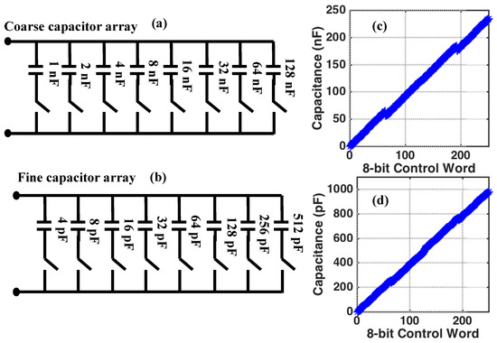 The coarse-tuning capacitor array has steps, which is not accurate enough to adequately balance the bridge. Therefore, a fine-tuning capacitor array, shown in Figure 10b, is connected in parallel with the coarse-tuning capacitor array. The structure of the fine-tuning capacitor array is identical to that of the coarse-tuning capacitor array, except that the individual capacitor values are different, as seen in Figure 10a. Figure 10d shows the simulated capacitance as the 8-bit digital control word is swept from to . The nominal capacitance of the fine-tuning array can be varied from to in steps of . Taken together, the coarse-tuning and fine-tuning capacitor arrays can realize a capacitor range from to in steps of .