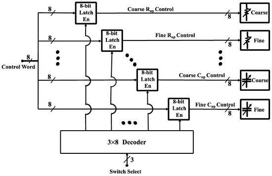 The digital control unit for 8-bit capacitive (2 fine and 2 coarse) and resistive (2 fine and 2 coarse) array switches. Each 8-bit array is connected to an 8-bit latch (CY74FCT2573TSOC, Texas Instruments), the total 8 latch enables are controlled using a decoder (CD74HC238, Texas Instruments), the 8-bit control word from the MCU (MSP432P401R, Texas Instruments) is written to the specific array after the corresponding latch is enabled by the decoder.