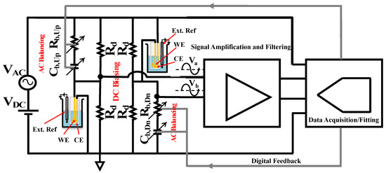 The two transducers are immersed in a PBS (pH 7.4) solution. For the transducer in the lower leg of the bridge, the working electrode is connected to the bridge output node , and the counter electrode is connected to ground. The transducer in the upper leg of the bridge has its working electrode connected to the bridge output node , and the counter electrode is connected to the excitation source. The output of the bridge is connected to a custom designed, fully differential signal acquisition module which itself consists of an analog signal processing block and an analog-to-digital converter.