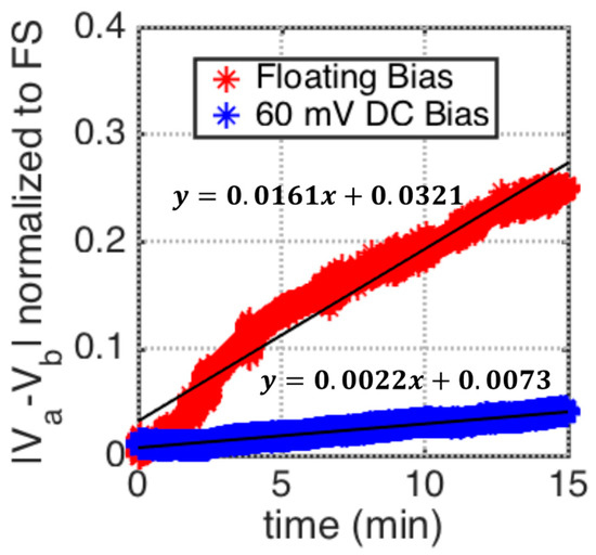 Other than random events occurring at the electrode surface, such as the displacement of the thiol chains, one major reason for drifting in the electrode-solution interface capacitance is the faradaic leakage current flowing from any un-blocked surface pin-holes [20]. Therefore, by biasing the solution and the working electrode at the same DC potential, the flow of the faradaic currents, and hence the drift rate, can be reduced. To demonstrate this, the experimental setup shown in Figure 13 is used to measure the change in working electrode interface capacitance with a , AC excitation, and DC bias at the bridge. The transducers are submerged in PBS ( pH 7.4) solution, described in Section 4.1. After balancing, the working electrodes in the setup are biased at DC with respect to ground. The differential output voltage, is then measured for two cases. The first case, indicated by the blue curve in Figure 14, uses an external Ag/AgCl reference electrode to bias the solution at , with respect to ground. The second case, indicated by the red curve in Figure 14, the reference electrode is removed from the solution. It is seen in Figure 14 that when the solution is biased at the same DC potential as the working electrode, the drift rate is reduced by a factor of 7.3.