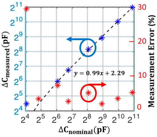 Sensitivity analysis for a 1% fractional capacitive change on , where the measured capacitance is plotted for each corresponding manually adjusted binary-weighted 8-bit capacitance change . The measurement error is calculated using .