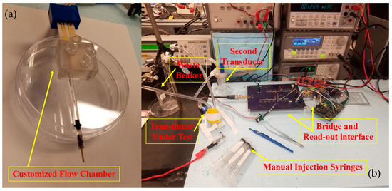 Finally, the system is used to detect MCLR toxin, the experimental setup shown in Figure 16 with two transducers is used and the working electrodes are functionalized with MCLR mAb using the process described in Section 4.1. One of the transducers as transducer under test is placed in a custom-designed flow chamber shown in Figure 16a, with a volume of approximately . The flow chamber has an inlet for injecting solution, an outlet for waste, and two ports for the transducer and external Ag/AgCl reference electrode. The customized flow chamber is tightly sealed after the transducer under test and the external Ag/AgCl reference electrode are inserted, the second transducer is placed in a beaker containing 10 mL of PBS solution, the solution is also biased through an external Ag/AgCl reference electrode and the beaker is covered with a cap as shown in Figure 16b. The second transducer with functionalized working electrode, in the upper leg of the bridge, is required to maintain a differential measurement structure. Efforts were made to ensure that both solutions were maintained at equal temperatures. Finally, the AC excitation, and DC bias, at the bridge input are set to and , respectively. Both working electrodes and both solutions inside the flow chamber and beaker were biased at DC with respect to ground for drift suppression.