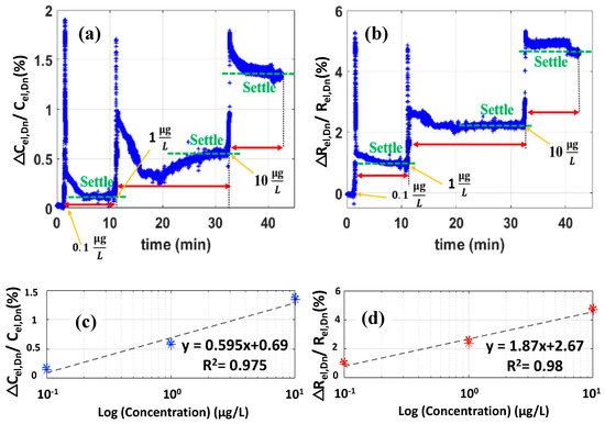 Raw real-time extracted fractional transducer (a) capacitance and (b) resistance percent change with MCLR concentrations of 0.1 , 1 , and 10 injected at 2, 10, and 31 min. Initially after the balance the stability of the signal is observed for around 2 min and then the first concentration of MCLR is injected. Due to the very high sensitivity of the system the disturbance caused by the injection leads to spikes, therefore, the next concentration in injected after a settled signal is observed. The results show clearly distinct signal levels both for the resistance and capacitance fractional changes. (c) Plot of relative capacitance change, as a percentage of the nominal capacitance, and (d) plot of relative change in the transducer resistance, as a percentage of the nominal resistance, versus the log of MCLR concentration. Measured values for and are extracted from the settled values of Figure 17a,b.